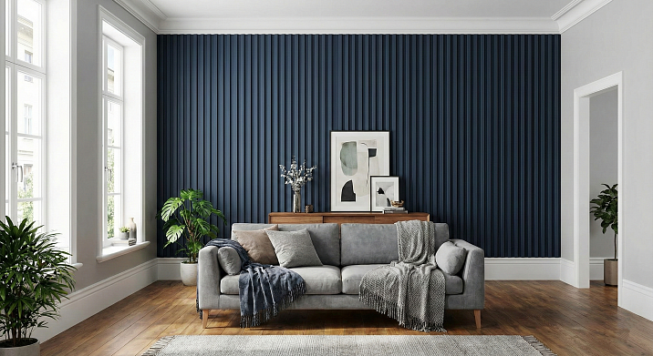 Акцентная стена с вертикальными панелями, карнизом и плинтусом — не только визуальное решение, но и функциональная система, решающая практические задачи.
