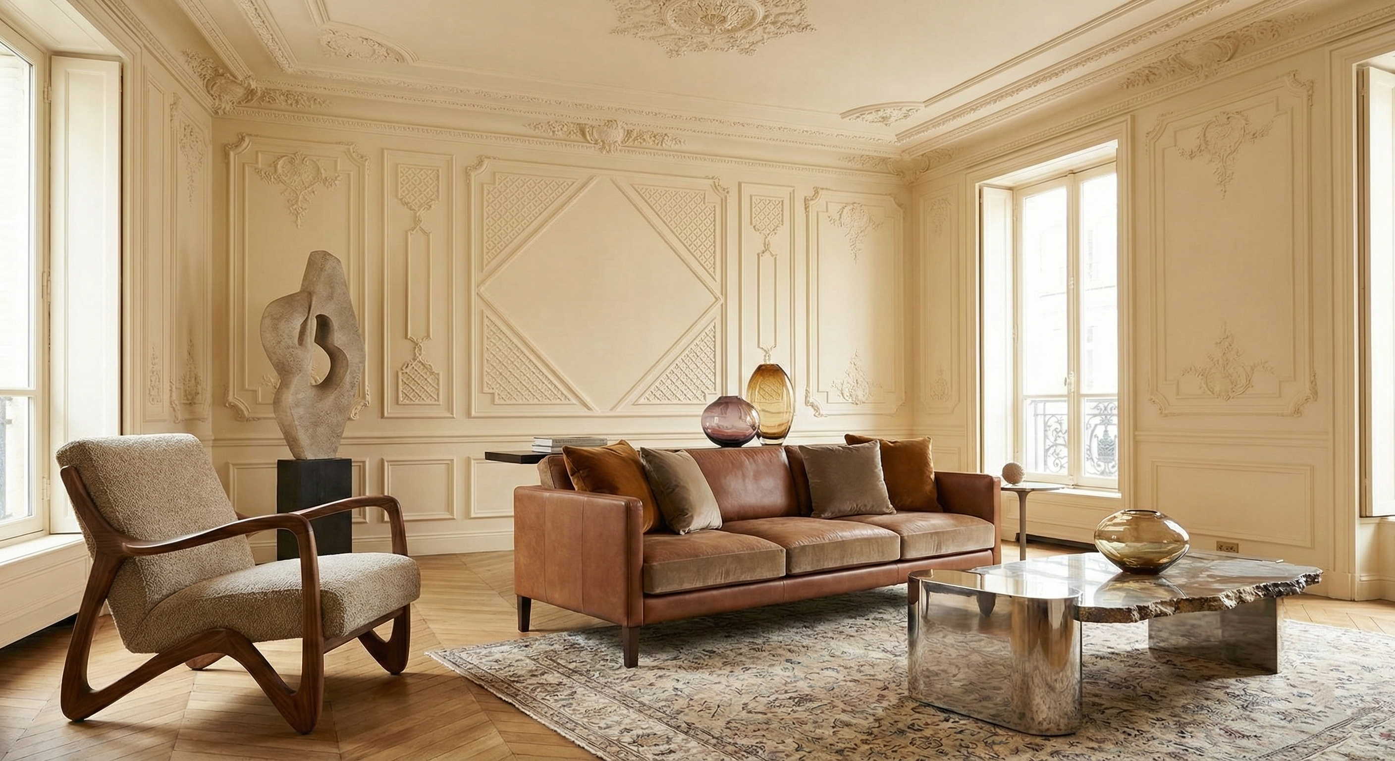 Contrast of forms: sculptural quality of furniture and architectural quality of molding