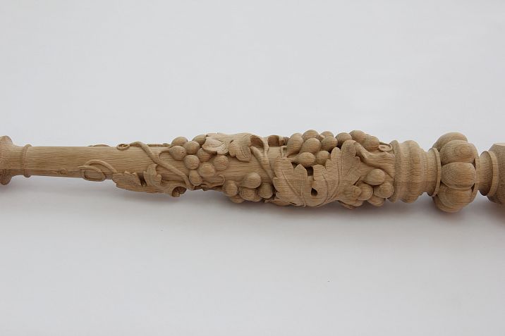 Carving on round balusters requires special skill. Working on a cylindrical surface is significantly more complex than on a flat surface, as the tool must constantly adapt to the changing curvature of the surface.