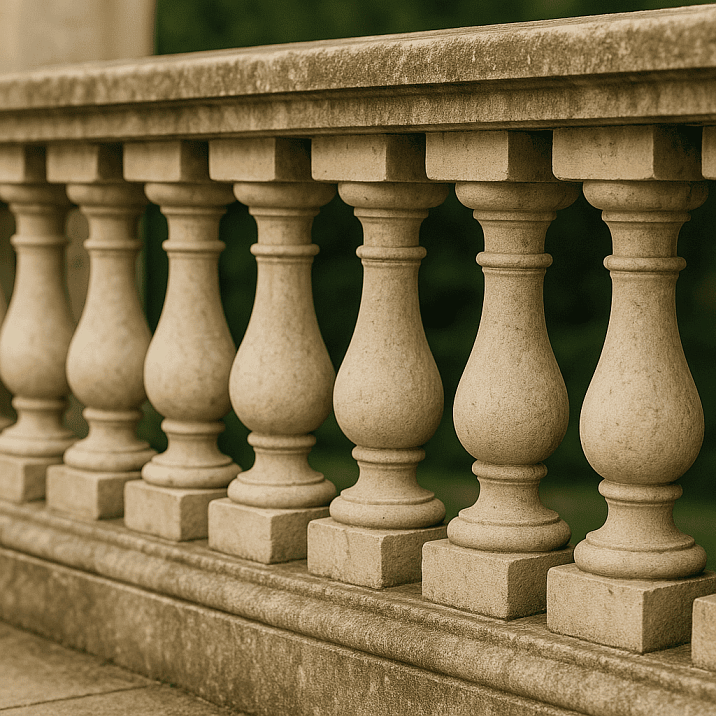 Balusters in the style of ancient columns with a base, shaft, and capital become miniature architectural masterpieces. The proportions of classical orders are adapted to the size of the baluster, preserving harmony and aesthetic perfection.