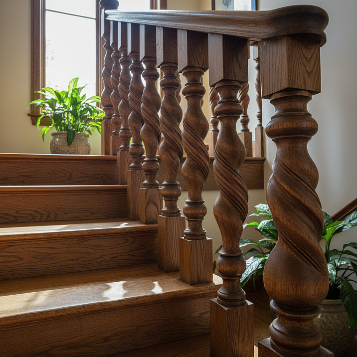 Точеные балясины круглого сечения стоят дороже - 250-400 рублей за сосну, 800-1200 за дуб. Точение - механизированный процесс, но он требует настройки станка, закрепления заготовки, контроля размеров. Простейший точеный профиль с минимальным количеством деталей добавляет к цене заготовки 30-50%.