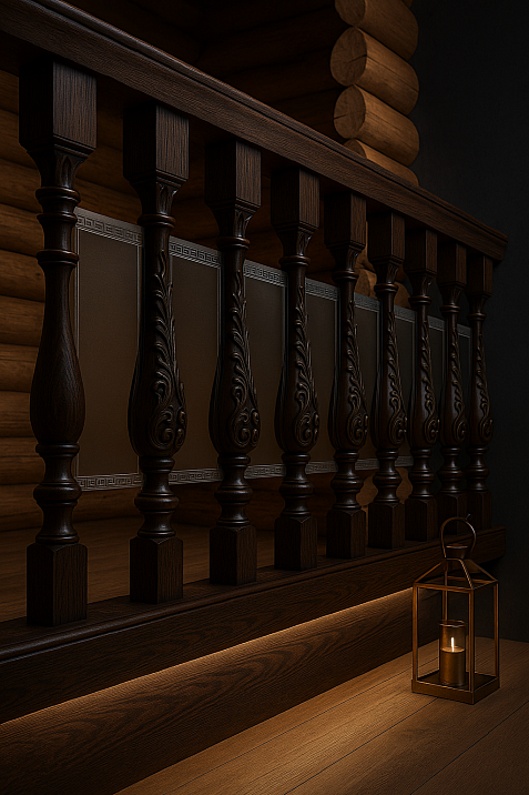 Photographs of balusters under different lighting show how drastically the perception of the same element can change. Morning light makes wooden surfaces warm and lively, evening lighting adds mystery and depth. Spot lighting can turn an ordinary staircase into a stage decoration.