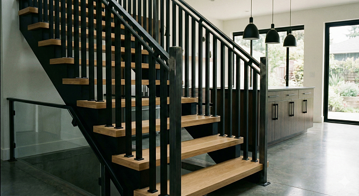 Освещение: Чёрные балясины требуют хорошего освещения — иначе теряются в тени. Направленные споты сверху или подсветка ступеней снизу создают драматичную светотень, подчёркивая ритм вертикалей.
