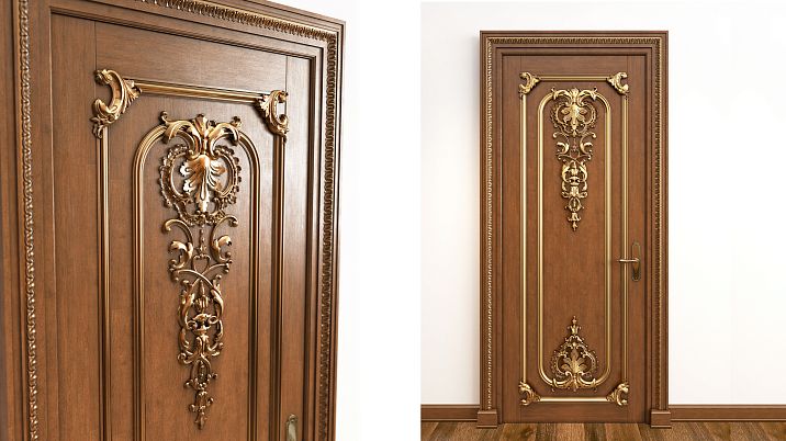 Entrance doors are suitable for more massive, solemn decorative elements. Large appliqués, wide moldings, and expressive rosettes create a sense of solidity and respectability. Materials must be especially strong and durable.