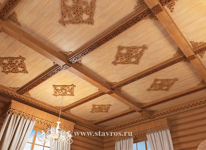 Russia has rich traditions of wooden construction, reflected in ceiling decor. Wooden beams, painted ceilings, carved elements — all of this constitutes a unique heritage of Russian decorative art.