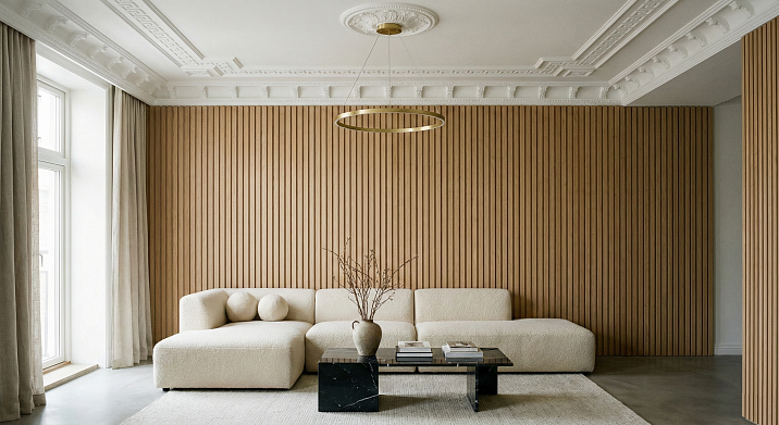 requires compositional balance: overloading with details destroys integrity, while a lack makes the interior flat. The distribution rule states: one wall gets one type of decorative element—either slats or moldings—while the other walls remain neutral or painted in a base color. Exceptions are symmetrical compositions in spacious rooms, where a slatted TV zone can echo molding frames on the opposite wall.Decorative FinishingRequires compositional balance: overloading with details destroys integrity, while a lack makes the interior flat. The distribution rule states: one type of decorative element per wall—either slats or moldings—with the remaining walls kept neutral or painted in a base color. An exception is symmetrical compositions in spacious rooms, where a slatted TV zone can echo molding frames on the opposite wall.