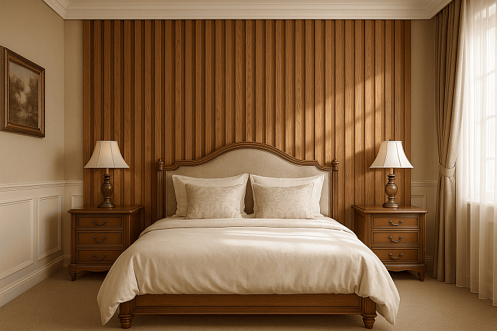 Neoclassical interiors use decorative planks to create a modern version of traditional wall panels—boiserie. Complex multi-step profiles, noble tones of oak and walnut, and golden accents create a palace-like luxury atmosphere.