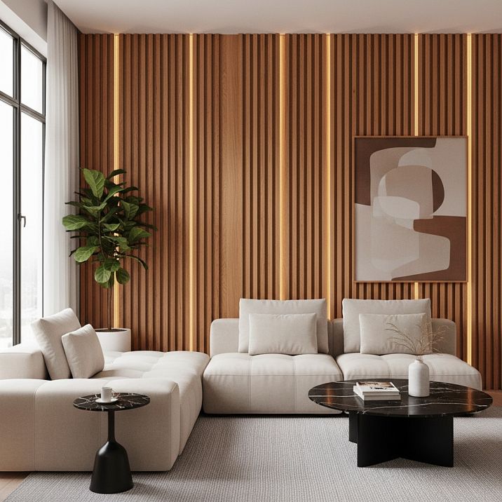 One of the most impressive effects of using decorative slats is their ability to create a complex play of light and shadow. This characteristic transforms static wall surfaces into dynamic, living interior elements that change throughout the day in response to natural lighting.