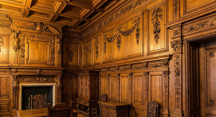 Baroque — luxury, opulence, abundance of decoration. BaroqueCarved interior decoris characterized by dynamic forms, floral ornaments, garlands, cartouches, mascarons. Carving is deep, expressive, often gilded or patinated. Suitable for spacious rooms with high ceilings — living rooms, grand bedrooms, offices.