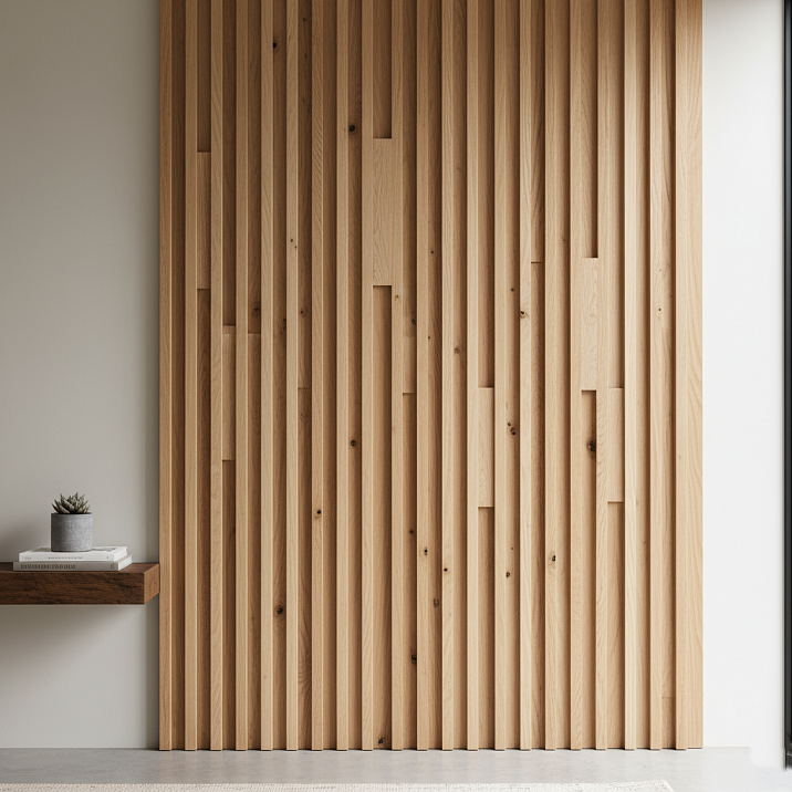 Modern design tends toward complex geometric compositions.Buy wooden planks for decorationof various sizes allows creating multi-level compositions that play with light and shadow.