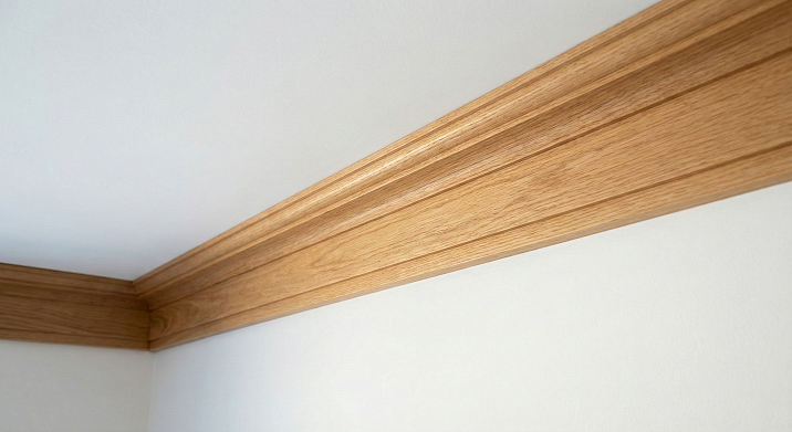 Карниз из натурального дерева с сохранённой текстурой, естественным или тонированным цветом на окрашенных стенах и потолке создаёт органический акцент, природную тепло, материальный контраст. Светлое дерево (ясень, берёза) на белых стенах создаёт скандинавскую органичность. Тёмное дерево (орех, мореный дуб) на светлых стенах — контрастную рамку. Натуральный дуб на бежевых стенах — тёплую гармонию.