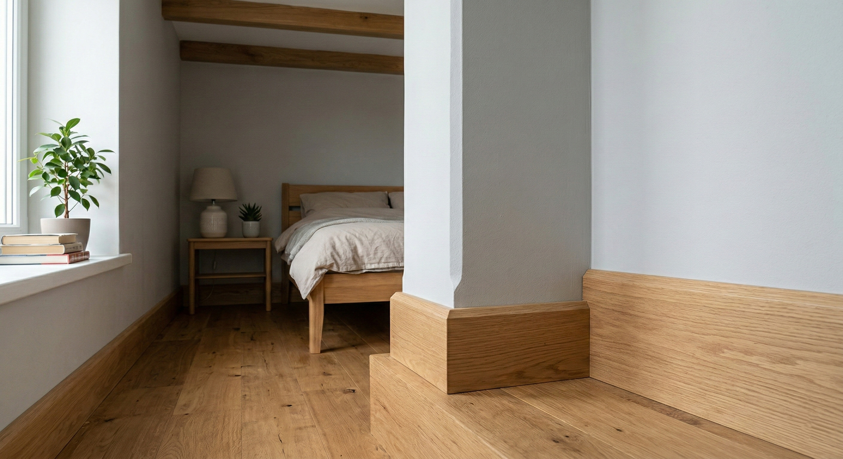 Conversely: a narrow30 mm wooden skirting boardor 45 mm almost 'disappears' at the base of the wall. The eye doesn't linger on it, moves freely upward. The room subjectively feels more spacious and taller.