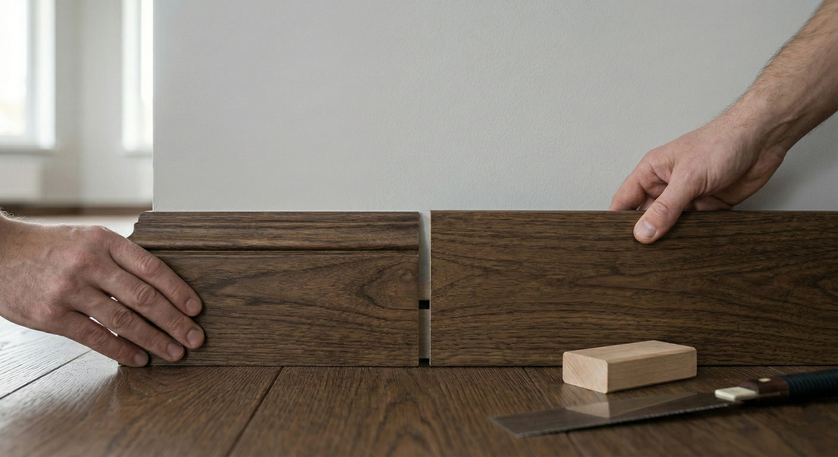 Деревянный плинтус, привезённый с производства, имеет влажность 8–10%. В жилом помещении с отоплением — 35–45% относительной влажности воздуха. Разница в 25–35% — плинтус будет отдавать влагу и немного сжиматься после монтажа.