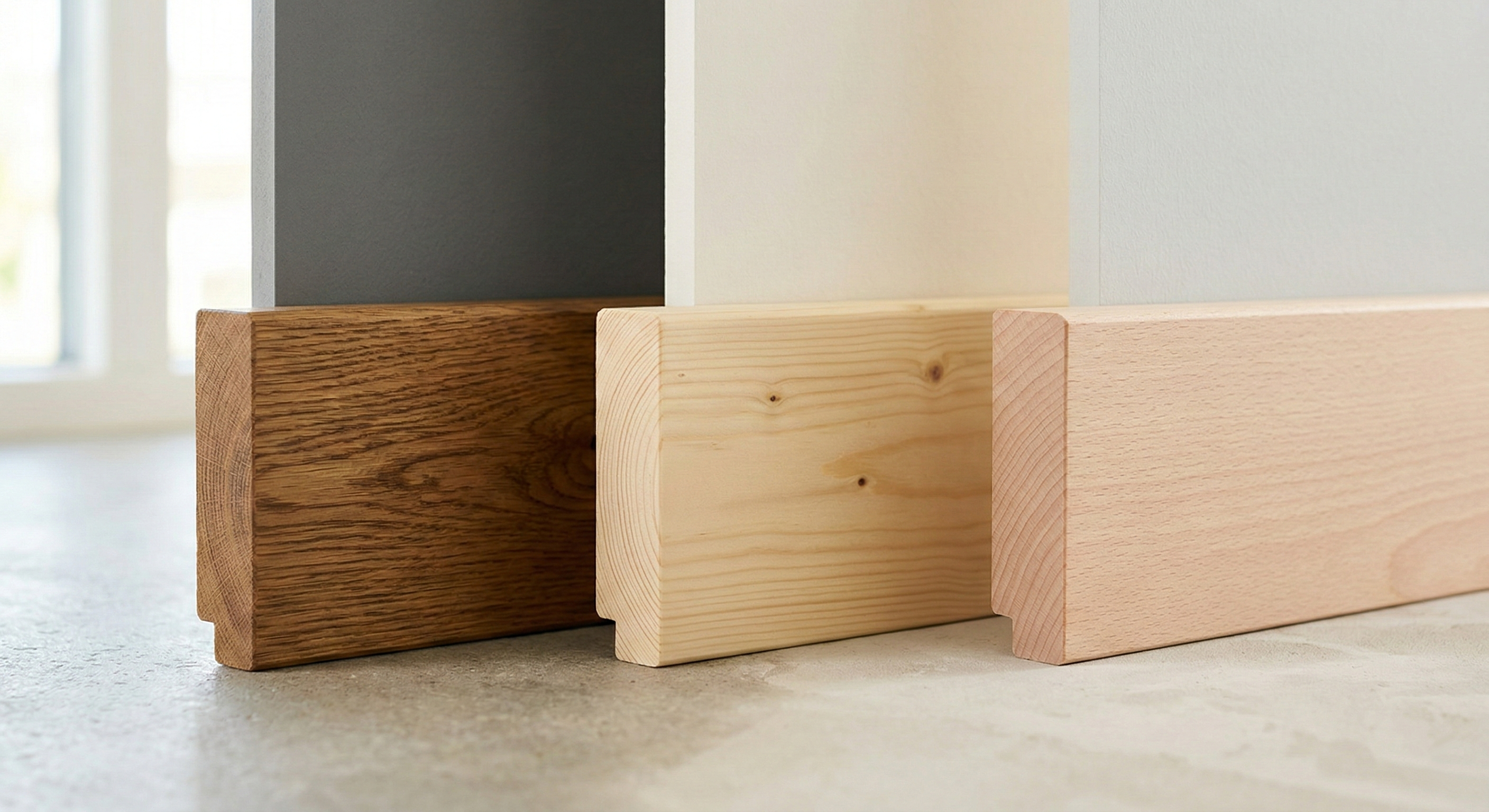 Choosing a species for a wooden skirting board means choosing the character of your floor. Because the skirting board is a boundary, and what it is made of determines its durability, its appearance under the coating, its behavior in the room, and how organically it will fit into the interior.