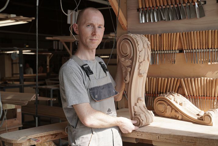 Updating carvings is a delicate task requiring high craftsmanship. Worn details are restored using hand tools with precise reproduction of the original pattern.