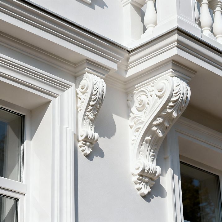 The high level of air pollution is also characteristic of the Moscow climate. Exhaust gases from vehicles, industrial emissions, road dust — all of this settles on building facades, creating additional stress on decorative coatings.Facade decoration made of polyurethaneThanks to their chemical properties, they resist pollution better than other materials and are easy to clean.