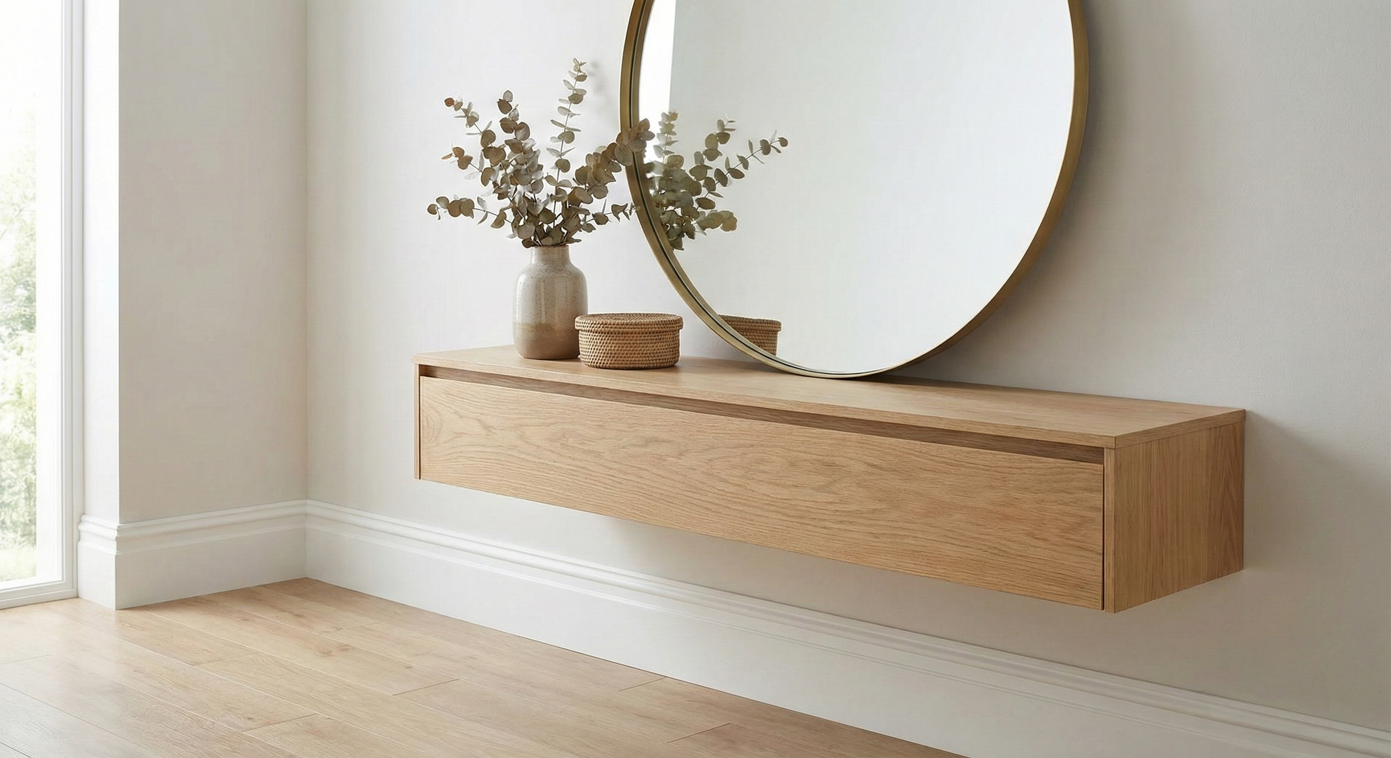 Белые стены + светлый пол + натуральный дубовый плинтус + натуральная дубовая консоль + натуральная дубовая рама зеркала: скандинавская эстетика, свет, природность