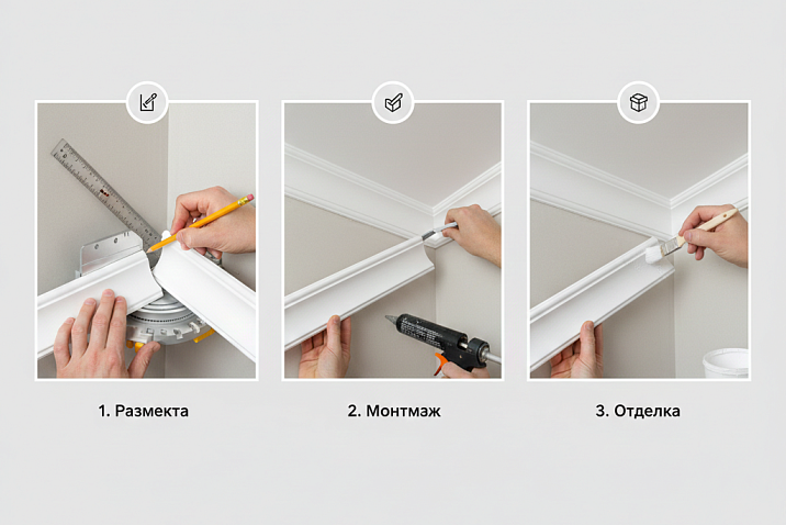 Ключевые моменты успеха: тщательная подготовка поверхности (ровность, прочность, грунтовка), точная резка углов (измерение угломером, использование стусла или торцовочной пилы, зачистка торцов), правильный выбор клея (акриловый для интерьера, фасадный для улицы, полиуретановый для тяжёлых элементов), качественная заделка стыков (герметик, шпатлёвка, шлифовка), финишная покраска (акриловая краска, два слоя, детальное прокрашивание рельефа).