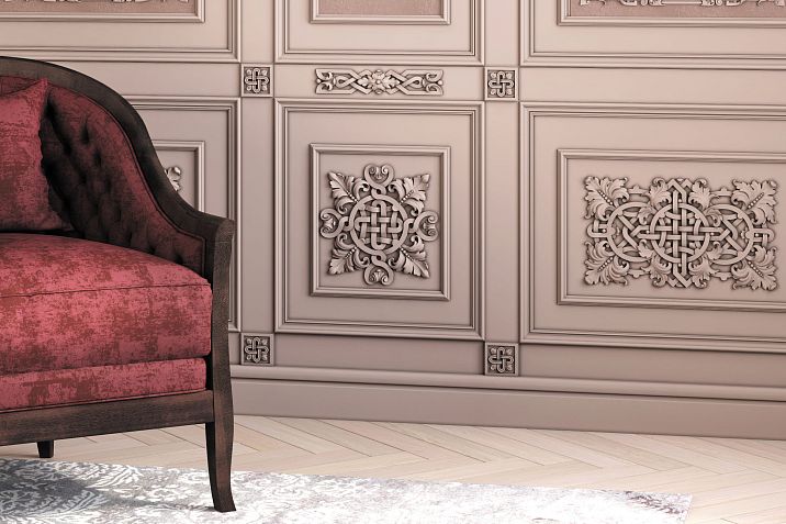 Columns and pilasters with carved capitals can zone space without creating a sense of clutter. Russian Style Collection offers numerous options for decorating such elements — from minimalist forms inspired by northern traditions to elaborately decorated styles reminiscent of Moscow Baroque.