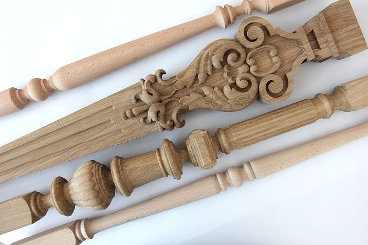 - Variety of species with different textures and shades. For making balusters, oak, beech, ash, pine, birch, larch, and other species are used.