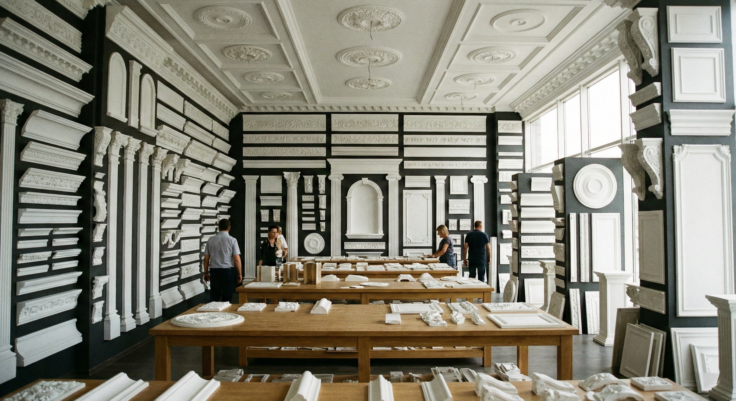 Local showrooms stock only popular items (cornices, skirting boards, standard-sized rosettes up to 80 cm, columns up to 3 meters). Rare and large-sized products are ordered directly from manufacturers (via website, by phone, custom production lead time 5-15 days, delivery by transport companies, minimum order amount usually 15,000-25,000 RUB).