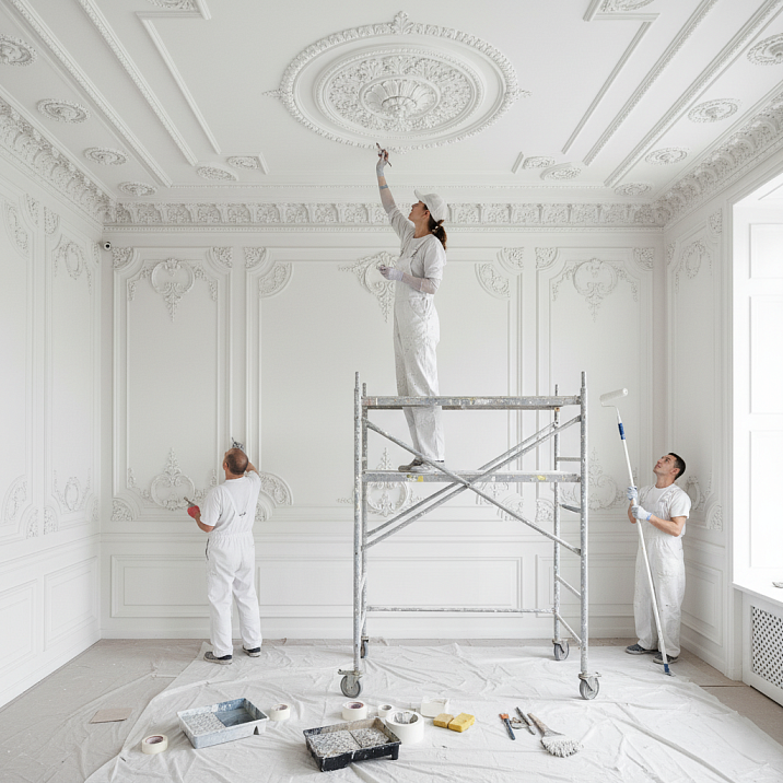Painting ceiling cornices and skirting boardsWorking with ceiling elements requires special care — the risk of drips is highest. Use a ladder or scaffolding of appropriate height — working from a stool is unsafe and inconvenient. Wear protective goggles and headgear — paint may drip, and it’s better to anticipate this in advance.