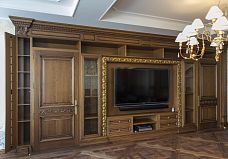 Add carved appliqués to cabinet doors, replace standard handles with decorative ones, and update facades with moldings. Such a transformation of furniture will give it a luxurious look and make it the main focal point of the room.