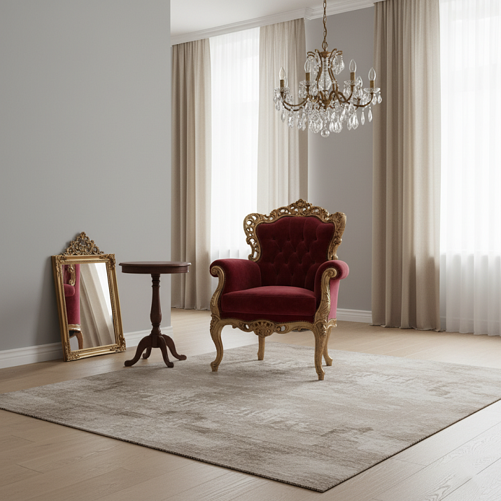 Upholstery fabric determines the character of the chair no less than carving. Baroque requires rich, dense fabrics with pronounced texture. Velvet — the genre's classic, it catches light, creates a soft glow, looks expensive and solemn. Brocade, tapestry, embroidered silk — all these are baroque fabrics. But the upholstery color must be chosen according to the surroundings. If the room is light, with white or beige walls, the chair can be a deep saturated color — burgundy, emerald, dark blue. If the interior already has dark accents, the chair is better to choose light — cream, gold, dusty rose. The contrast between the chair and the background should be sufficient for the chair to stand out, but not so sharp that it looks foreign.