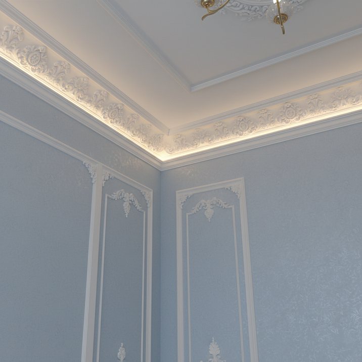 Ceilings above 3.5 m: cornices 18 cm and wider. Here, monumental multi-level profiles and complex compositions can be used. The room’s scale allows it.