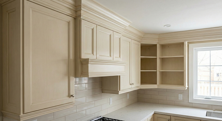 Depends on the kitchen painting technology. If the fronts are removed and painted separately (factory or workshop painting), the cornice is installed after the set is in place and painted on-site. If the kitchen is painted entirely on-site (rare), the cornice is installed before painting and painted along with the fronts. For pre-painted fronts, the cornice is installed after the kitchen is set up and painted separately.