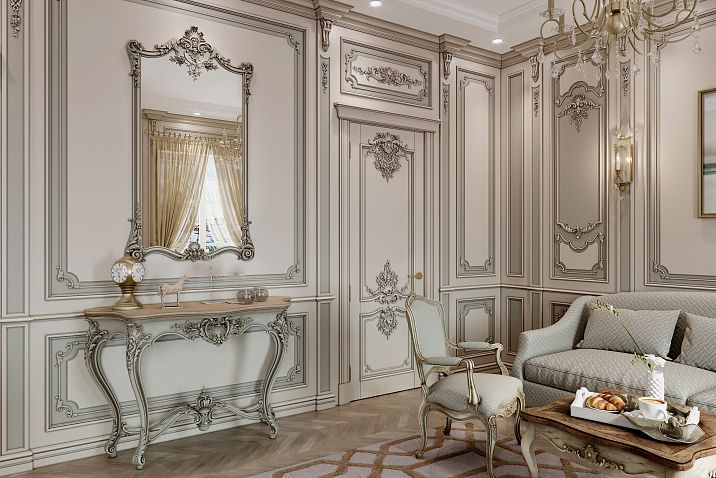 Mirrors in a classical interior serve multiple functions: they enlarge space, add light, and create interesting visual effects. Mirror placement requires special attention — they should reflect beautiful views, not random details.