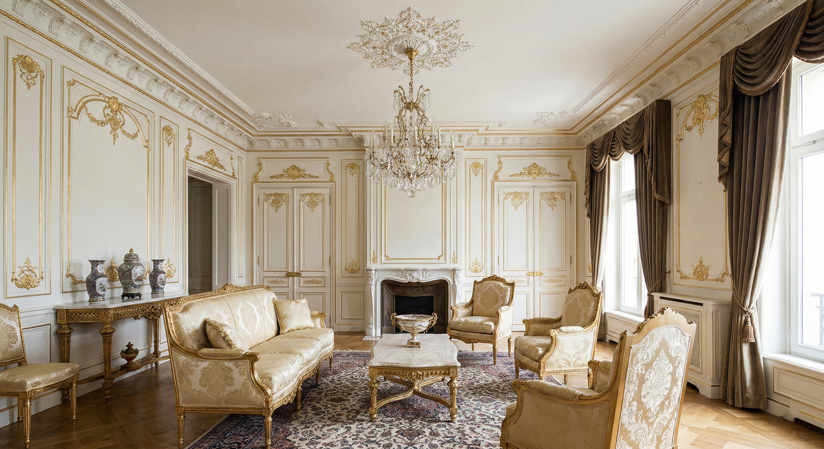 Потолочная розетка диаметром 100-150 см с обильным орнаментом — обязательный элемент дворцового интерьера. Розетка устанавливается в центре потолка гостиной, обрамляет место крепления люстры, создаёт композиционный центр, от которого расходится визуальная энергия пространства.