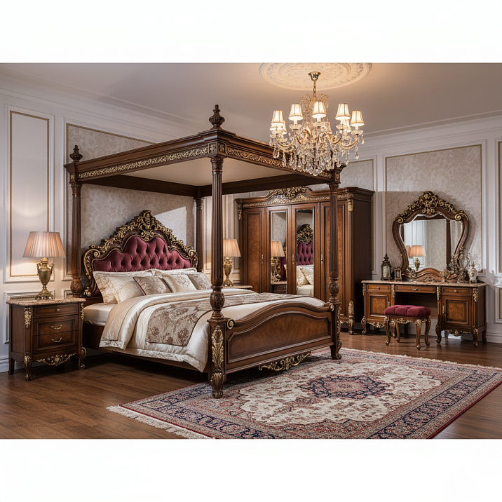 inclassic bedroom furnitureA solid wood headboard often has a complex profile: a cornice, a central panel with latticework, side pilasters. This is miniature architectural structure. Carving may be minimal (simple rolls, frames) or abundant (vegetal ornamentation, scrolls, rosettes) — depending on whether the interior leans toward restrained neoclassicism or lavish baroque classicism.