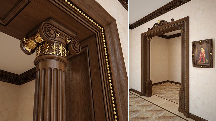 Residential spaces. Moldings, cornices, and wall panels add coziness and aristocracy to the living room, bedroom, and kitchen.