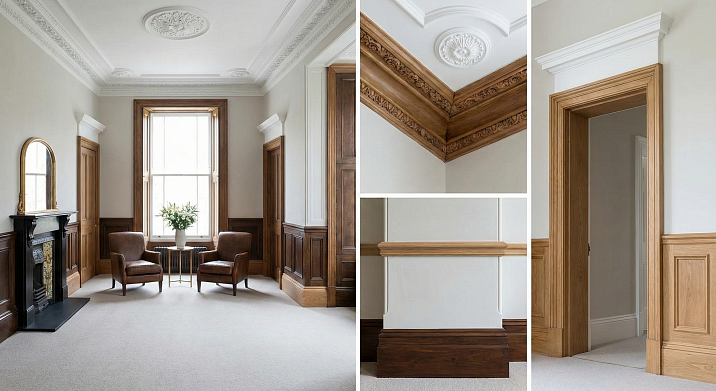 Классическая схема комплексного подхода: деревянные элементы на уровне пола и дверей (плинтусы, наличники, пороги), полиуретановая лепнина на уровне потолка и стен (карнизы, розетки, молдинги), возможно деревянные карнизы на потолке для усиления связи с полом. Дерево создаёт опору, заземлённость, связь с природой. Полиуретан создаёт воздушность, декоративность, архитектурную сложность. Вместе они формируют сбалансированную систему, где натуральность уравновешивается технологичностью, тяжесть — лёгкостью, простота — орнаментом.