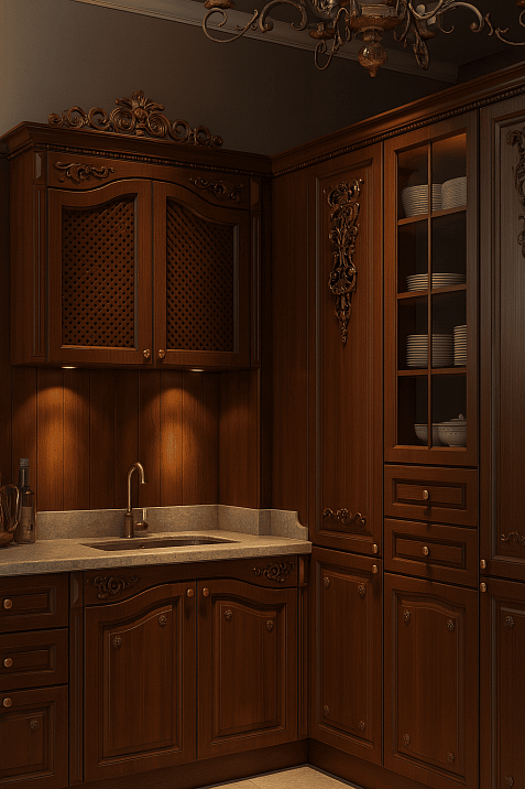 The color palette of neo-classical kitchens leans toward noble shades: deep walnut, noble oak, refined cherry. Patinated surfaces emphasize the status and elitism of the interior.