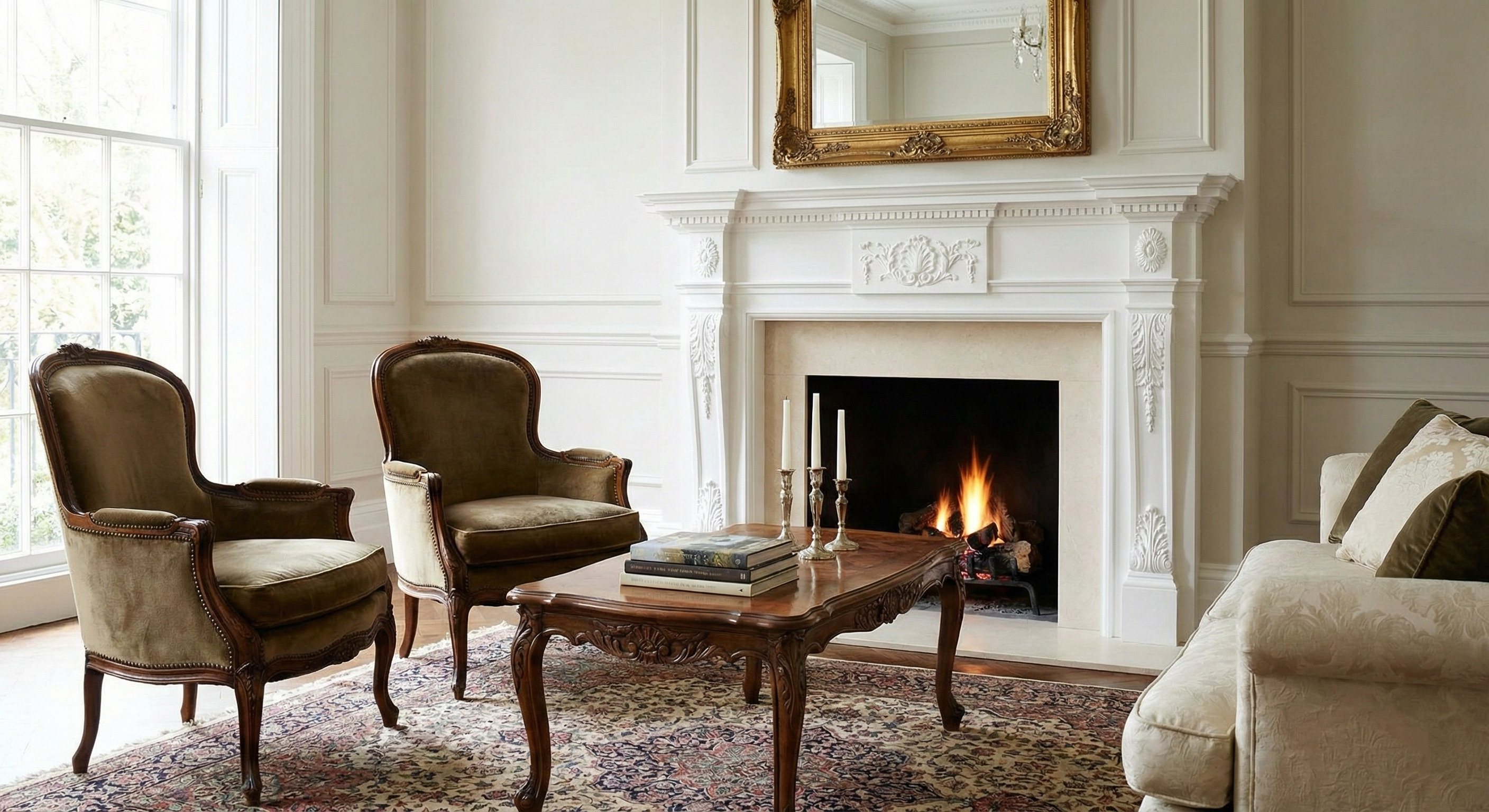 Classical furniture around the fireplace: creating a relaxation area