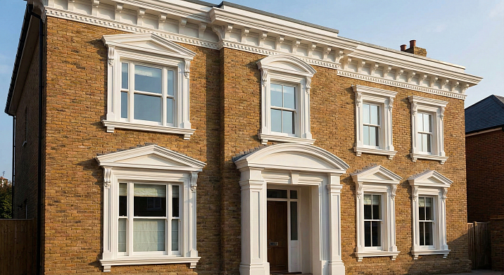 A standard box – brick, aerated concrete, SIP panels – stands bare. Rectangular window openings, a door, smooth walls, a roof slope. Function exists, architecture does not. The building is perceived as a warehouse, garage, temporary structure – even if a luxurious interior is created inside, the house remains silent on the outside.Polyurethane facade moldingtransforms a silent box into a speaking building. Casings frame the windows – rectangles become architectural openings with proportions, scale, and style. Portals frame the entry doors – the entrance ceases to be a hole in the wall, becoming a compositional center, a formal invitation. Interfloor cornices divide the facade horizontally – floors are visually separated, the building is read as a layered structure, not a monolith. Pediments, rustication, balustrades, keystones – dozens of elements, each serving a function: from purely decorative (adding detail) to practical (diverting water, protecting a corner, marking a boundary).