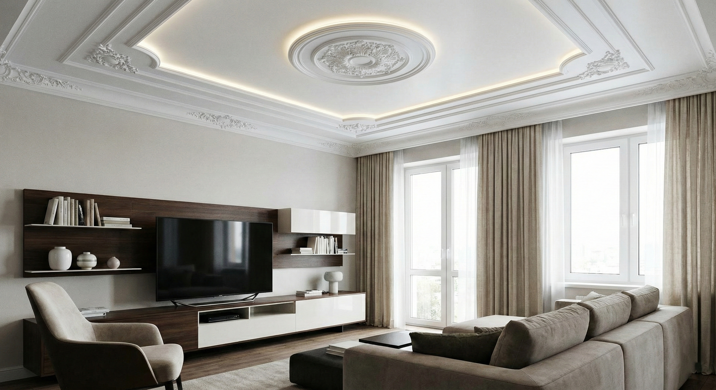 Телевизор. Центр притяжения в гостиной, вокруг которого выстраивается жизнь семьи — вечерние фильмы, воскресные сериалы, новости за завтраком, трансляции матчей с друзьями. Но как часто экран висит на голой стене, провода свисают неаккуратными петлями, а тумба под телевизором — случайный предмет мебели, купленный в спешке, не вписывающийся в общую концепцию комнаты? ТВ-зона требует продуманного оформления: потолок над зоной просмотра декорируется лепниной (создаёт акцент, визуально выделяет область), стена за телевизором обрамляется молдингами (рамка, превращающая экран в картину), современная мебель под телевизор объединяет технику и систему хранения (закрытые шкафчики для приставок, дисков, пультов, открытые полки для декора), напольный плинтус завершает композицию снизу. Лепнина из полиуретана на натяжной потолок — решение, сочетающее современные технологии (натяжные потолки популярны — ровная поверхность за день, десятки цветов и фактур) с классической эстетикой лепного декора.