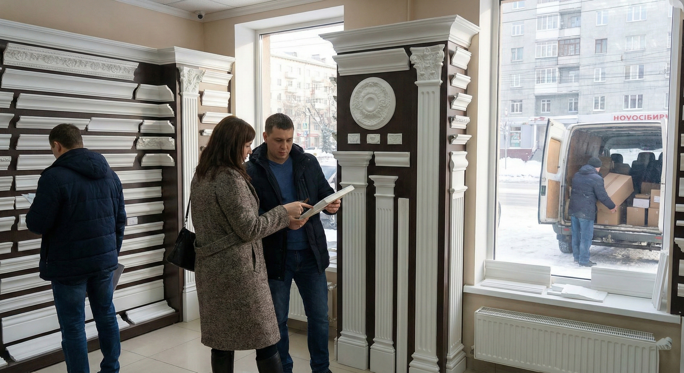 The city has showrooms specializing in molding and decorative materials. Showrooms are retail spaces of 50-200 m² (rarely larger — rent in Novosibirsk is cheaper than Moscow but more expensive than Voronezh, 1200-2800 rubles/m² per month in the center, 600-1400 rubles/m² on the outskirts), where samples are displayed (cornices on stands, rosettes on walls, column fragments, moldings on panels), and consultants work (help choose, calculate quantity, place orders).
