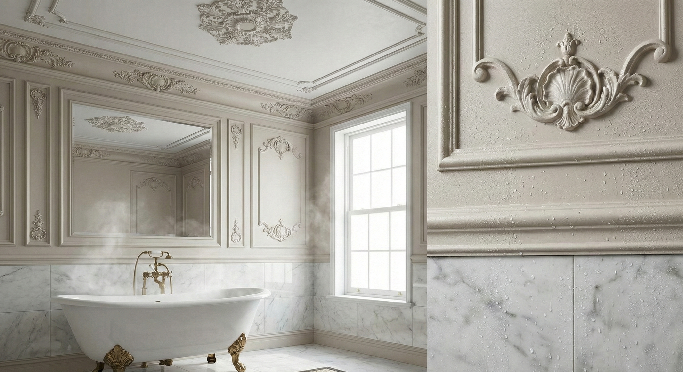 Yes, but with protective painting. Polyurethane is moisture-resistant, withstands direct water contact, but without painting it yellows over time (from hot water, steam, detergents). After installation, the molding is painted with moisture-resistant paint (latex for wet rooms, acrylic with antibacterial additives, or two-component epoxy — for maximum protection), joints are sealed with sanitary silicone (not acrylic sealant — silicone is more elastic, more reliable in areas of direct contact with water). Painted molding in a shower serves for decades without destruction, yellowing, or peeling.