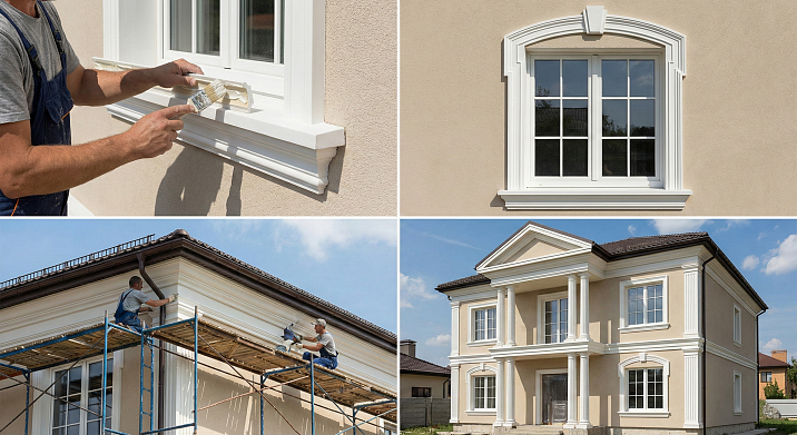 Сложность зависит от типа элементов. Простые карнизы, наличники, молдинги монтируются легко — технология интуитивна, ошибки несущественны. Сложные элементы (колонны из нескольких частей, многоуровневые карнизы с кронштейнами, арочные порталы) требуют опыта, точности, понимания конструкции. Если не уверены — начните с малого (оформите одно окно), если получится — продолжайте.
