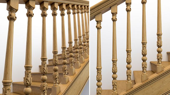 Столбы часто украшаются резными капителями, напоминающими архитектурные ордера. Балясины имеют характерную веретенообразную форму с чередованием утолщений и сужений. Такие элементы создают ощущение торжественности и парадности, подходящее для представительских интерьеров.