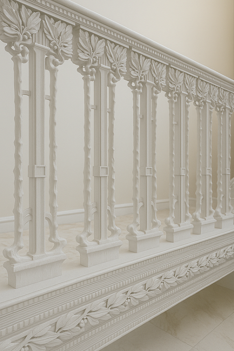Classic balusters feature complex profiles with alternating expansions and contractions, creating play of light and shadow. Traditional forms — vase, jug, spindle — have been tested over centuries and remain relevant in modern interiors. Carved elements add elegance and highlight the artisan’s handiwork.