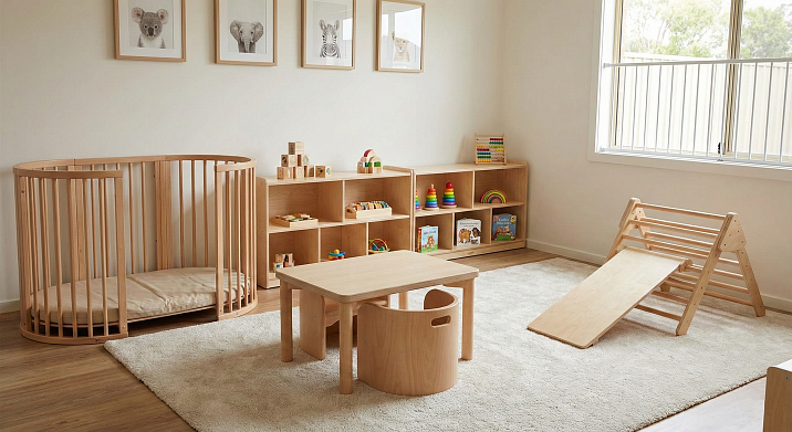 Системы хранения для детских — модульные стеллажи, комоды, шкафы из светлых пород дерева. Открытые полки для игрушек и книг, закрытые шкафы для одежды, выдвижные ящики для мелочей. Всё с скруглёнными углами, безопасной фурнитурой, устойчивой конструкцией. Креплениями к стене, предотвращающими опрокидывание.