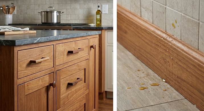 Wooden baseboardin the kitchen is regularly exposed to water during floor washing, may suffer impacts from dropped dishes or kitchen utensils, and is affected by grease splatters during cooking.