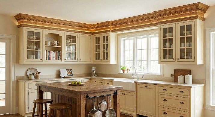 A kitchen in Provence style with painted facades in pastel tones requires a cornice with an aged effect. The cornice is painted white, cream, ivory, then artificially aged — patinated, sanded with sandpaper on the protrusions, creating wear. Height 80-100 mm, profile simple or classic. The cornice creates the feeling of old furniture that has served for decades.
