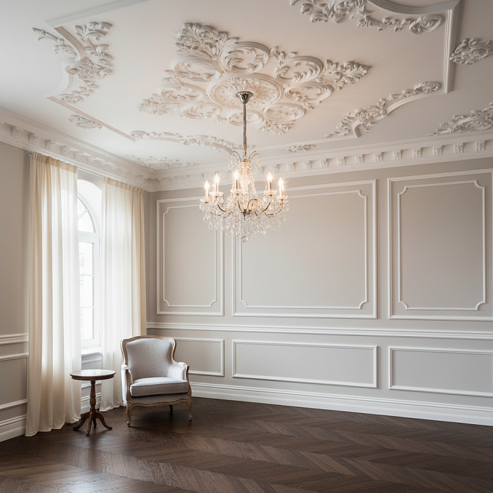 For standard ceilings, cornices 60–100 mm high are optimal. They are expressive enough to structure the space, yet not so heavy as to overwhelm it. For high ceilings (from 3.2 m), larger elements — up to 150–200 mm — can be used, but even here, moderation is key.