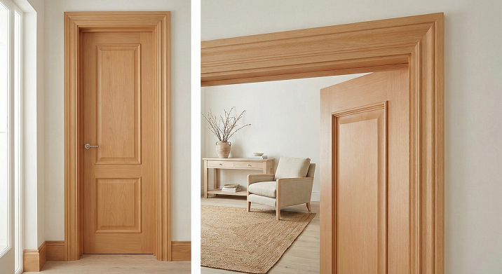 Двери — вертикали, которые разделяют пространство, но могут и объединять его, когда их обрамление становится частью стилистики всего интерьера. Наличник бук создаёт светлый, тёплый контур вокруг дверного проёма, который перекликается с цветом и текстурой мебели, формируя визуальное единство помещения. Бук — древесина с плотностью 700-790 кг/м³ и однородной мелкопористой структурой — даёт идеальную основу для обрамления дверей в интерьерах, где господствует светлая мебель. Светлые оттенки бука — от розовато-бежевого до кремово-жёлтого — гармонируют с берёзой, ясенем, беленым дубом, создавая пространство, где каждый элемент поддерживает общую тему естественного света и природного тепла.