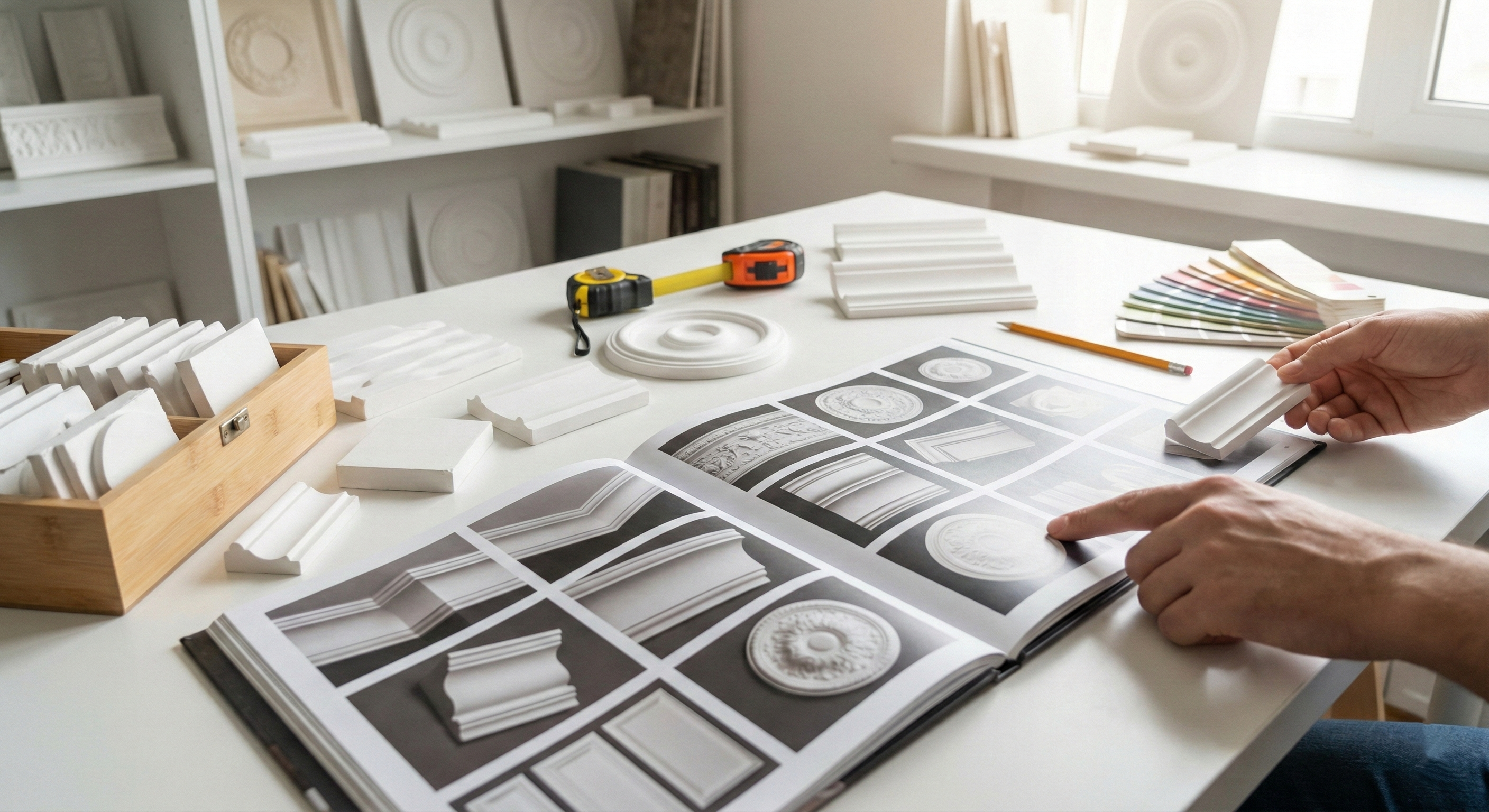 Check with samples: place samples of cornice, molding, baseboard, and rosette side by side. Visually assess: do the patterns match? If the cornice has small dentils (classicism) and the rosette has lush scrolls (baroque) — dissonance. Replace the rosette with a classic one with acanthus — harmony.